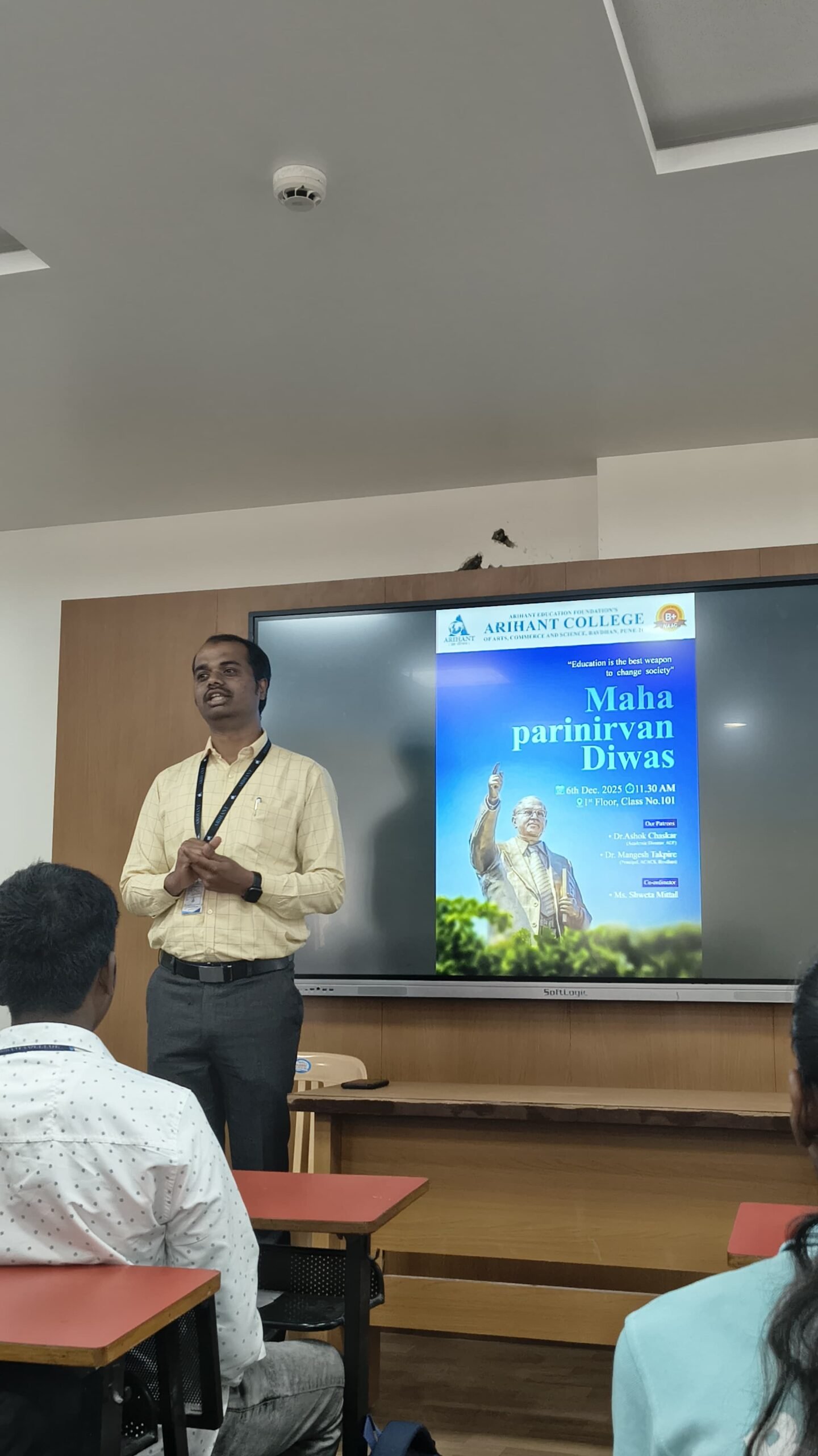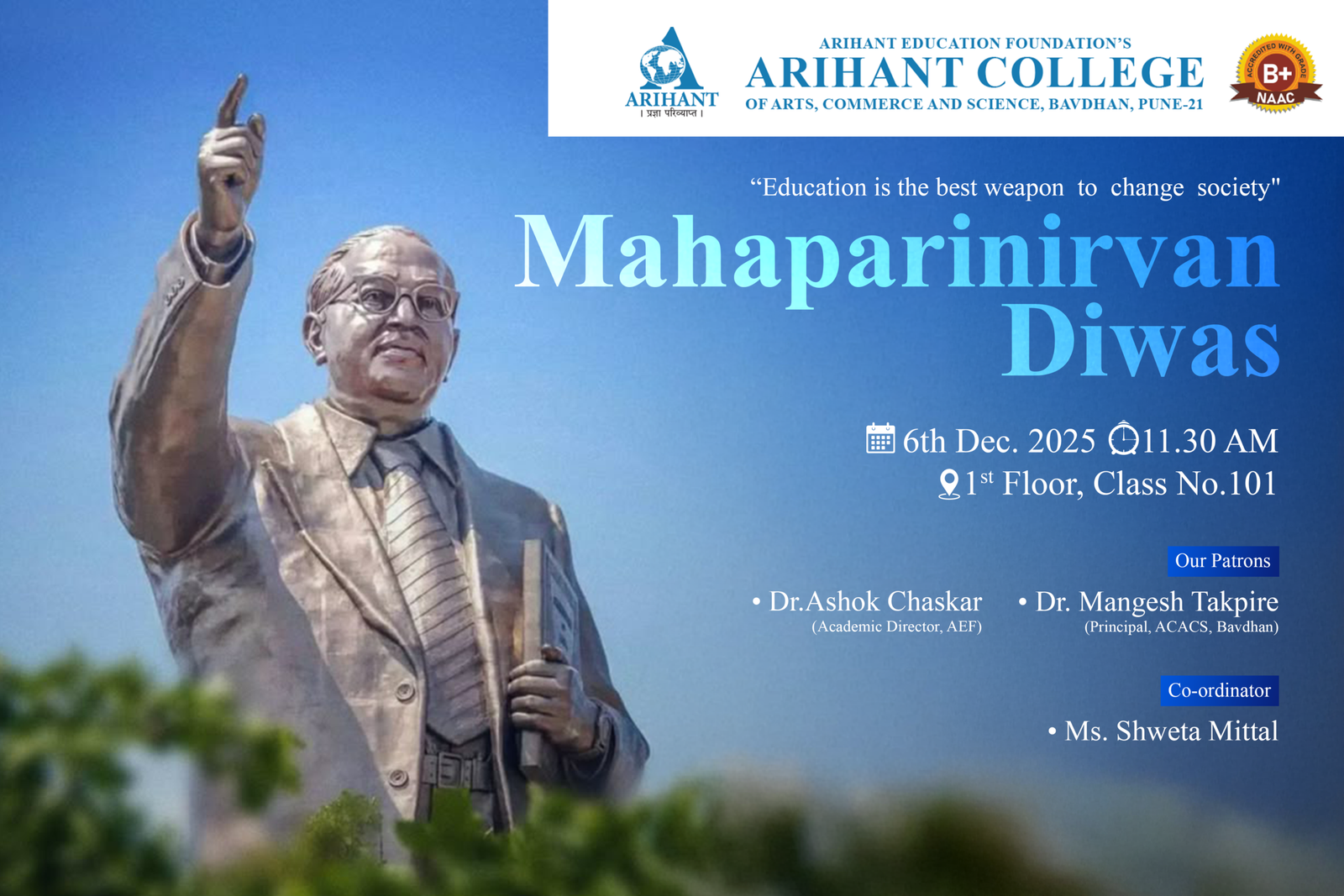 Arihant College of Arts, Commerce and Science, Bavdhan celebrated Mahaparinirvan Diwas on 6th December 2025 with respect and sincerity. The programme was organised to pay tribute to Dr. Babasaheb Ambedkar and to remind students of his important contribution to the nation.