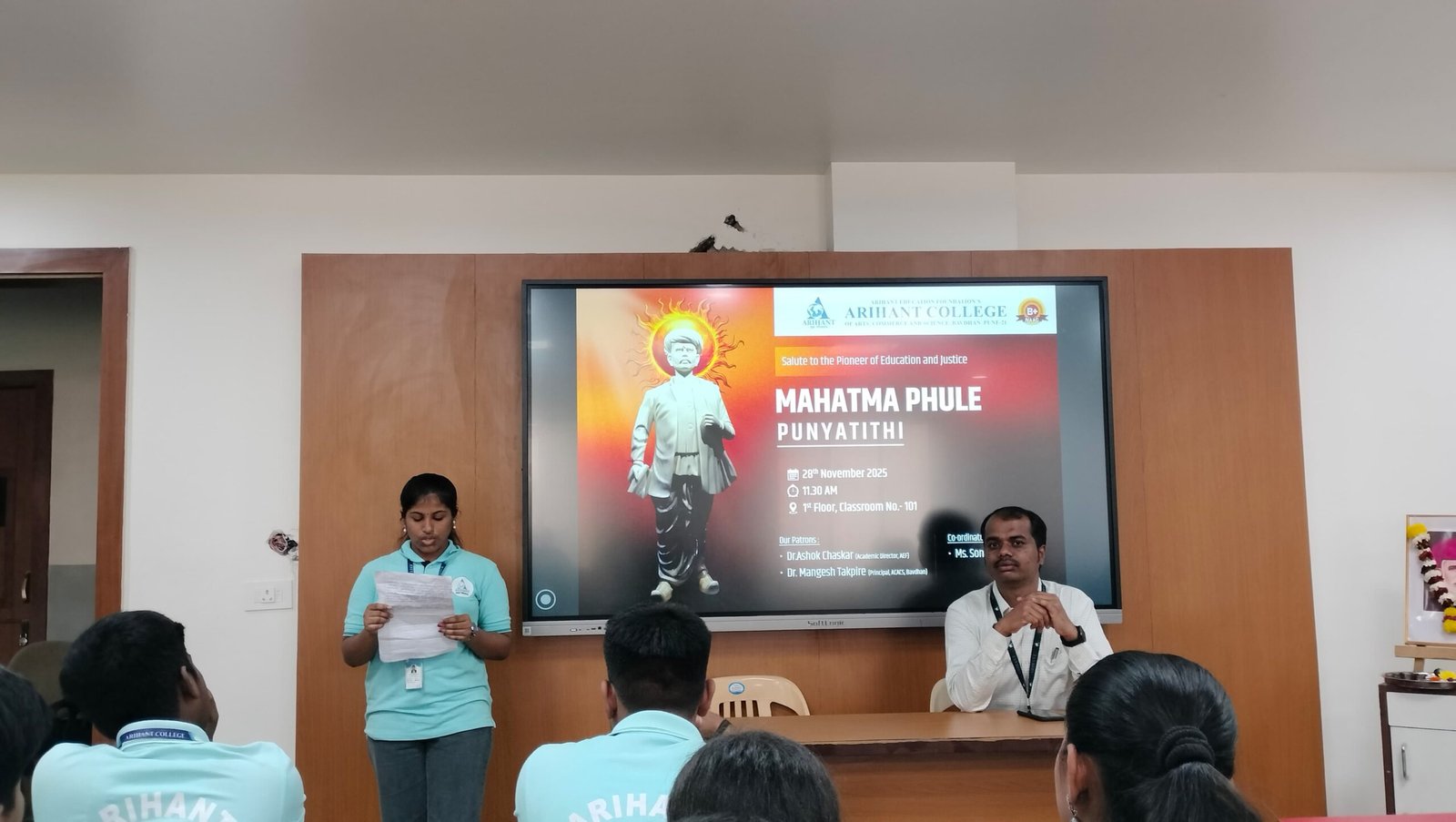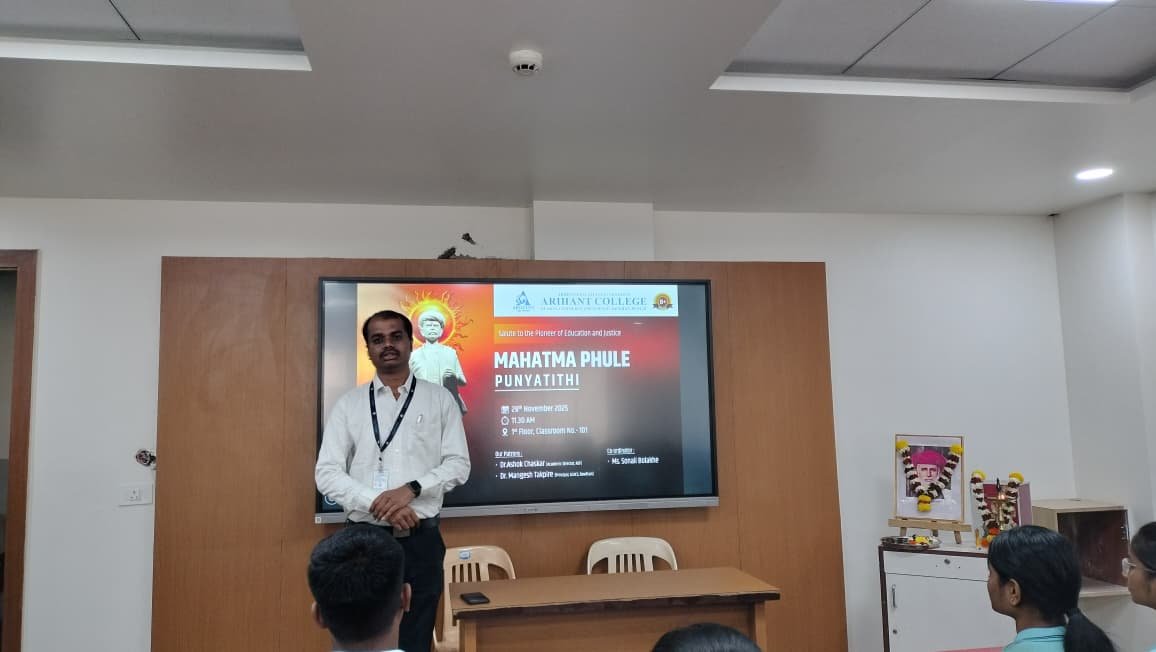 Mahatma Phule Punyatithi was organized to remember his Social work and his contribution to society, at Arihant College of Arts, Commerce and Science , Bavdhan , on 28th November 2025 by the Department of Humanities. Total 40 students and Faculty members attended the program.